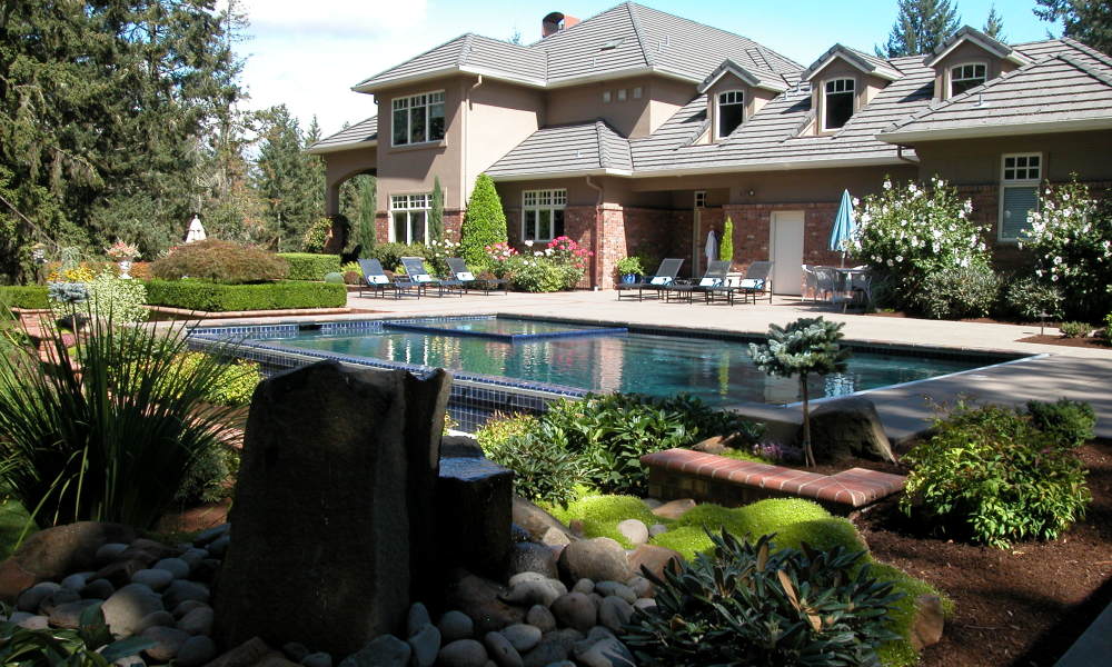The owners of this large property in southwest Eugene wanted a pool and outdoor seating area added seamlessly into their existing garden. We took advantage of the natural contours of the yard and oriented the pool so it would have a “vanishing edge” as viewed from the house across the water down toward the lower levels of the yard. Then we oriented the outdoor sitting area with all the amenities perpendicular to the house at one end of the pool. This forms a spacious outdoor room within a lush, mature garden.